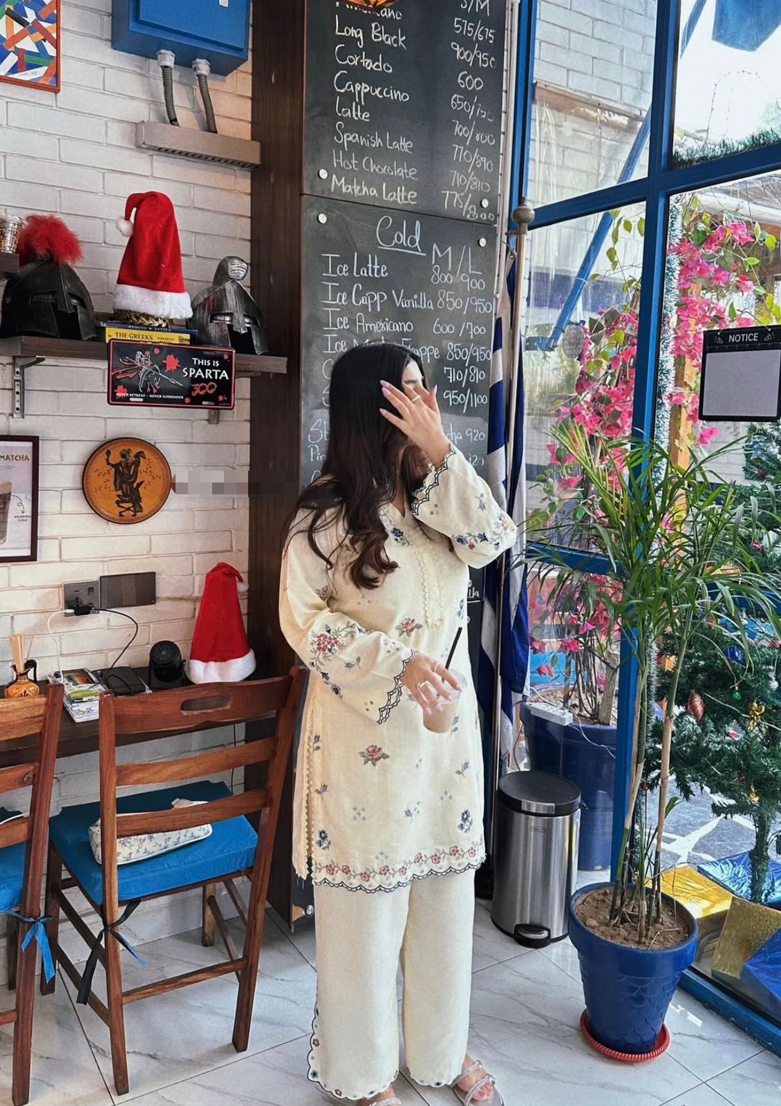 Paired with a matching karandi trouser, detailed with coordinated embroidery along the edges, this outfit reflects effortless sophistication. Its neutral tone and timeless silhouette make it ideal for everyday winter wear, casual gatherings, and understated festive moments.