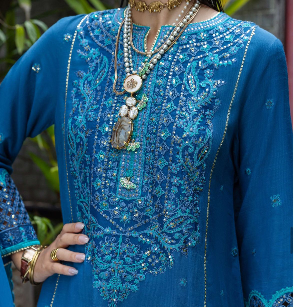 - Embroidered, sequined sleeves border (organza)