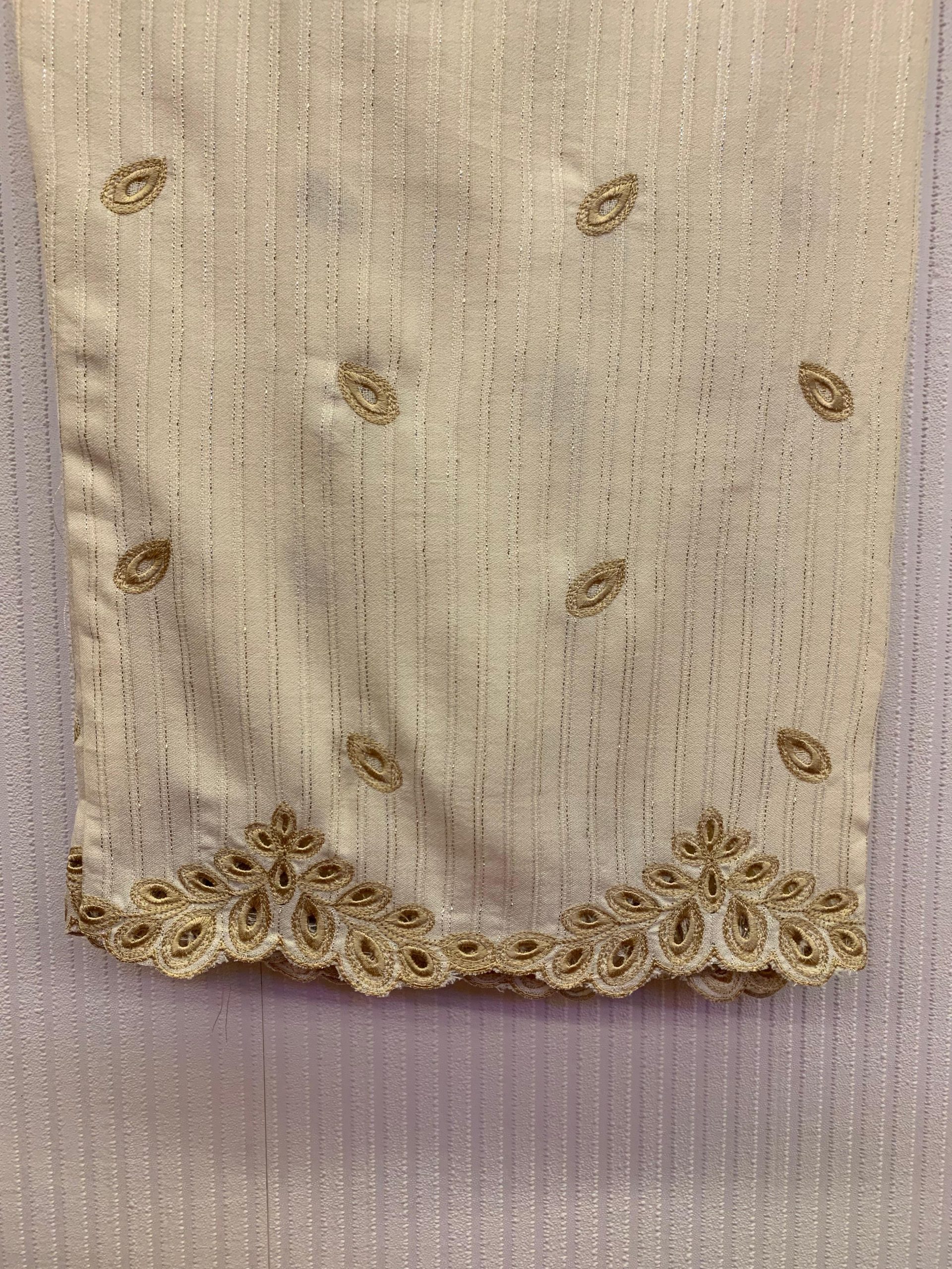Work: Beige thread embroidery on neckline, sleeves & borders