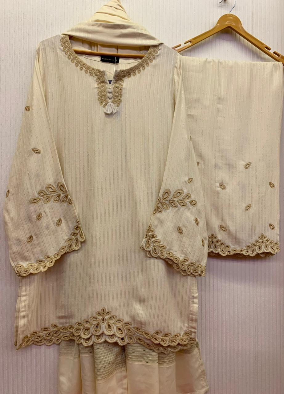 Elevate your everyday elegance with this beautifully crafted 3-piece linen suit, designed for women who appreciate comfort without compromising on style. Rendered in a rich offwhite hue, this outfit reflects understated sophistication with finely detailed beige embroidery that enhances its timeless appeal.